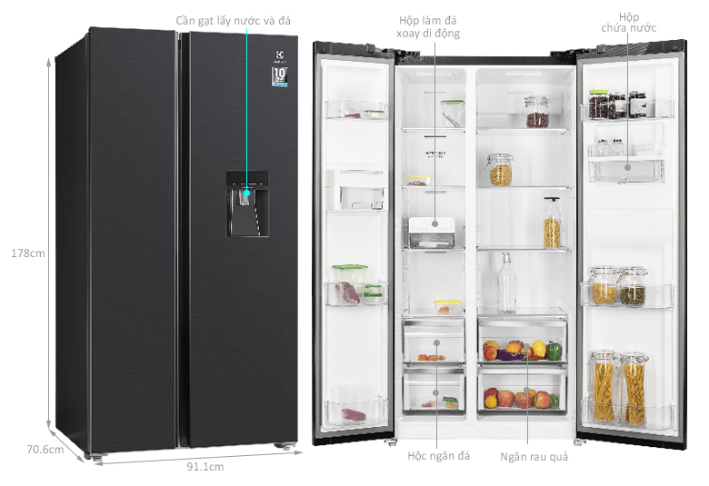 - Dung tích lớn: Tủ lạnh Electrolux 2 cửa Side By Side 571L ESE6141A-BVN có dung tích rộng rãi, đáp ứng nhu cầu lưu trữ thực phẩm của gia đình lớn.