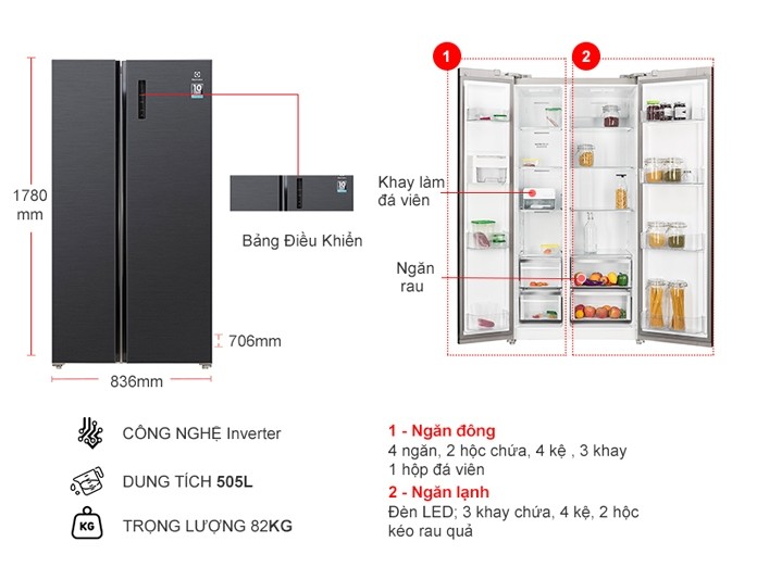 - Thiết kế 2 cửa Side By Side giúp tiết kiệm diện tích và dễ dàng truy cập